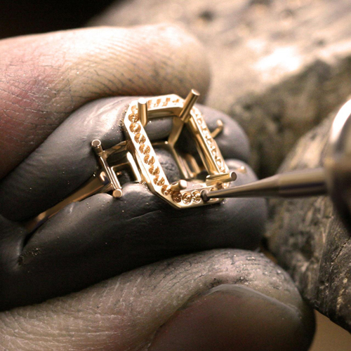 Sau khi phần thân sản phẩm đã được làm xong, các công đoạn chi tiết hơn, như gắn đá và chạm khắc, tiếp tục được thực hiện. Ổ chấu được cắt và rèn để giữ viên đá/kim cương trên sản phẩm.